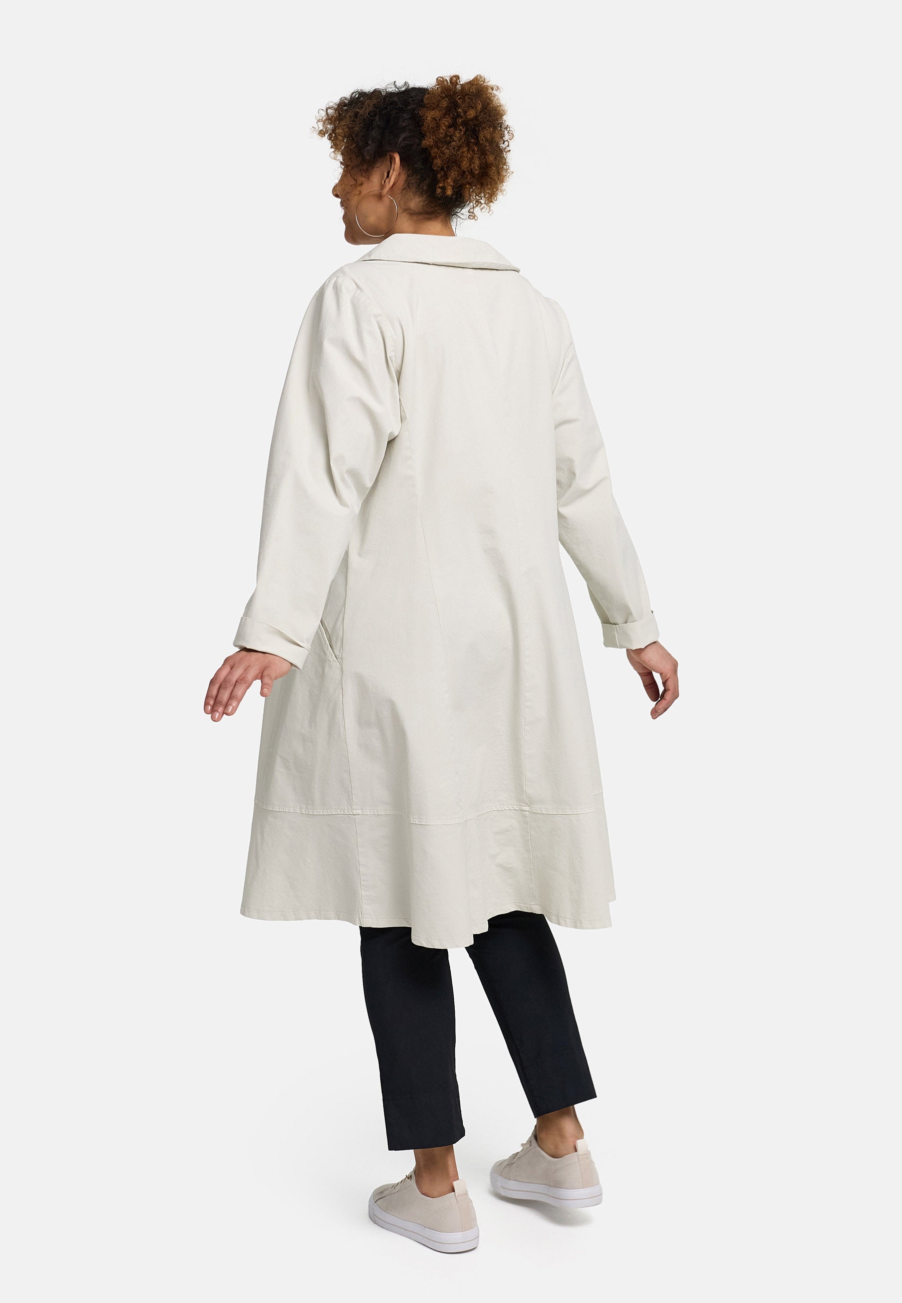 Das Material aus Baumwollmix fühlt sich atmungsaktiv und soft an, bleibt dabei formstabil und macht durch den Elastan-Anteil jede Bewegung mit. Der angesetzte Saum sorgt für einen feinen Swing, der beim Gehen mitschwingt – lässig, leicht und stilvoll. In Schwarz wirkt er souverän und urban, in Ecru/Offwhite frisch, clean und besonders edel.