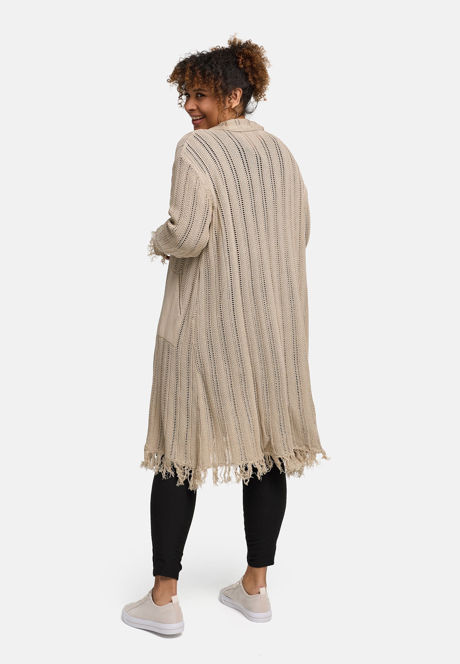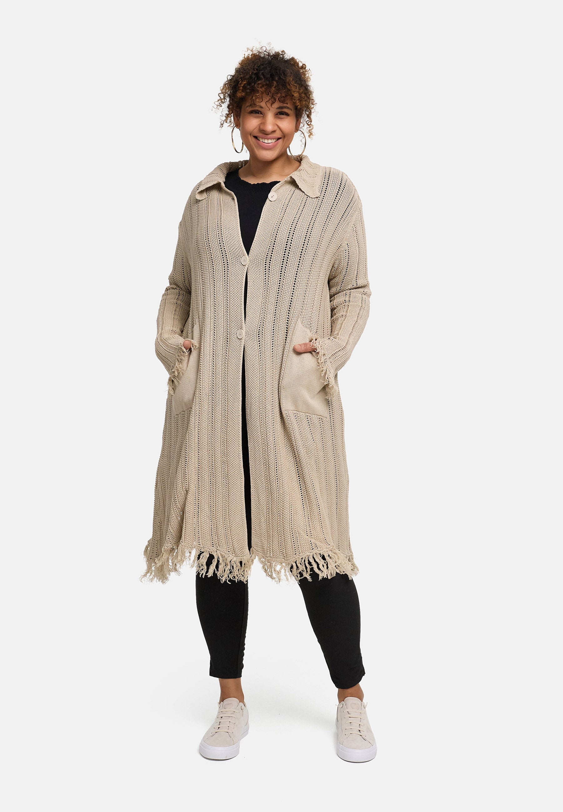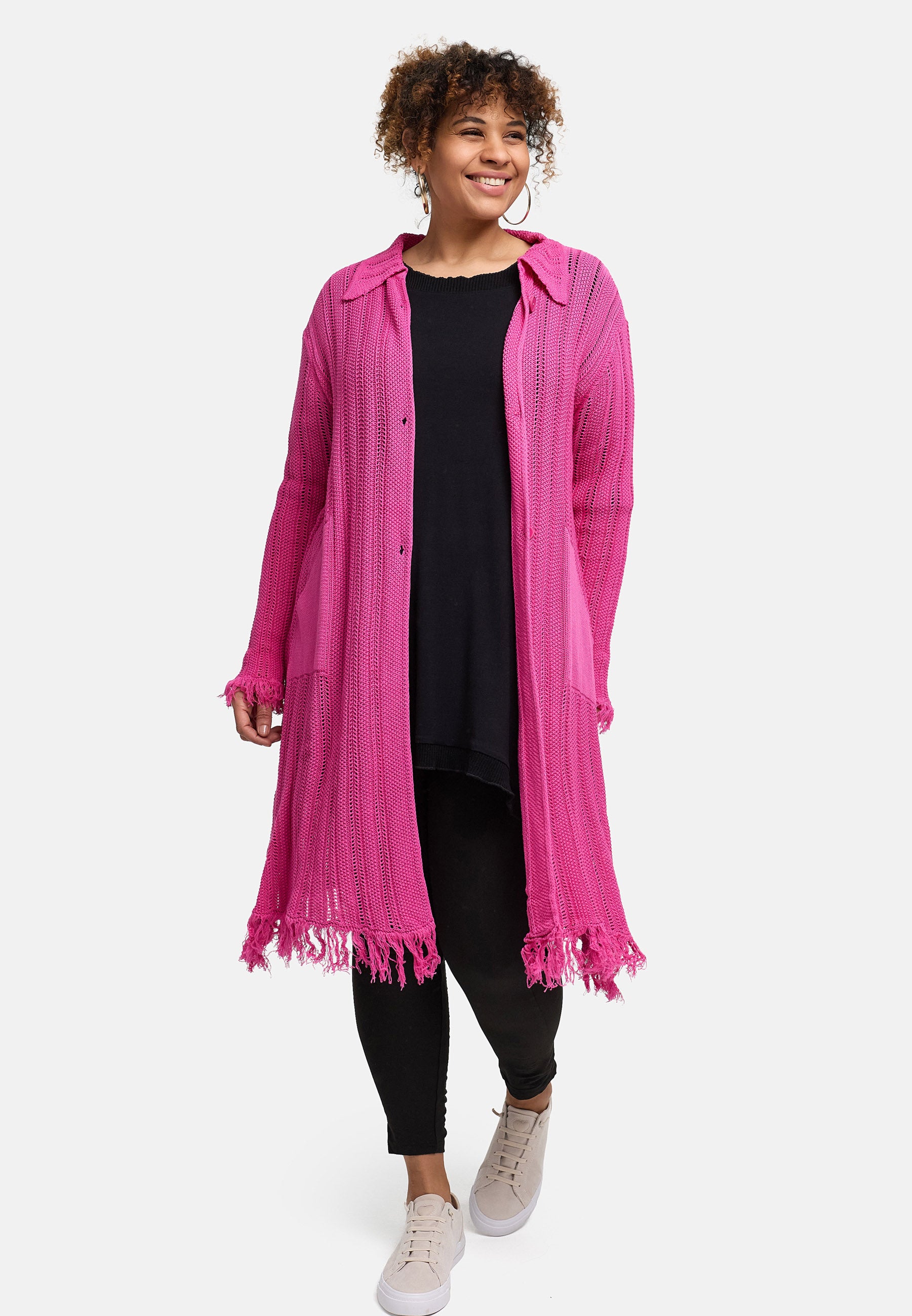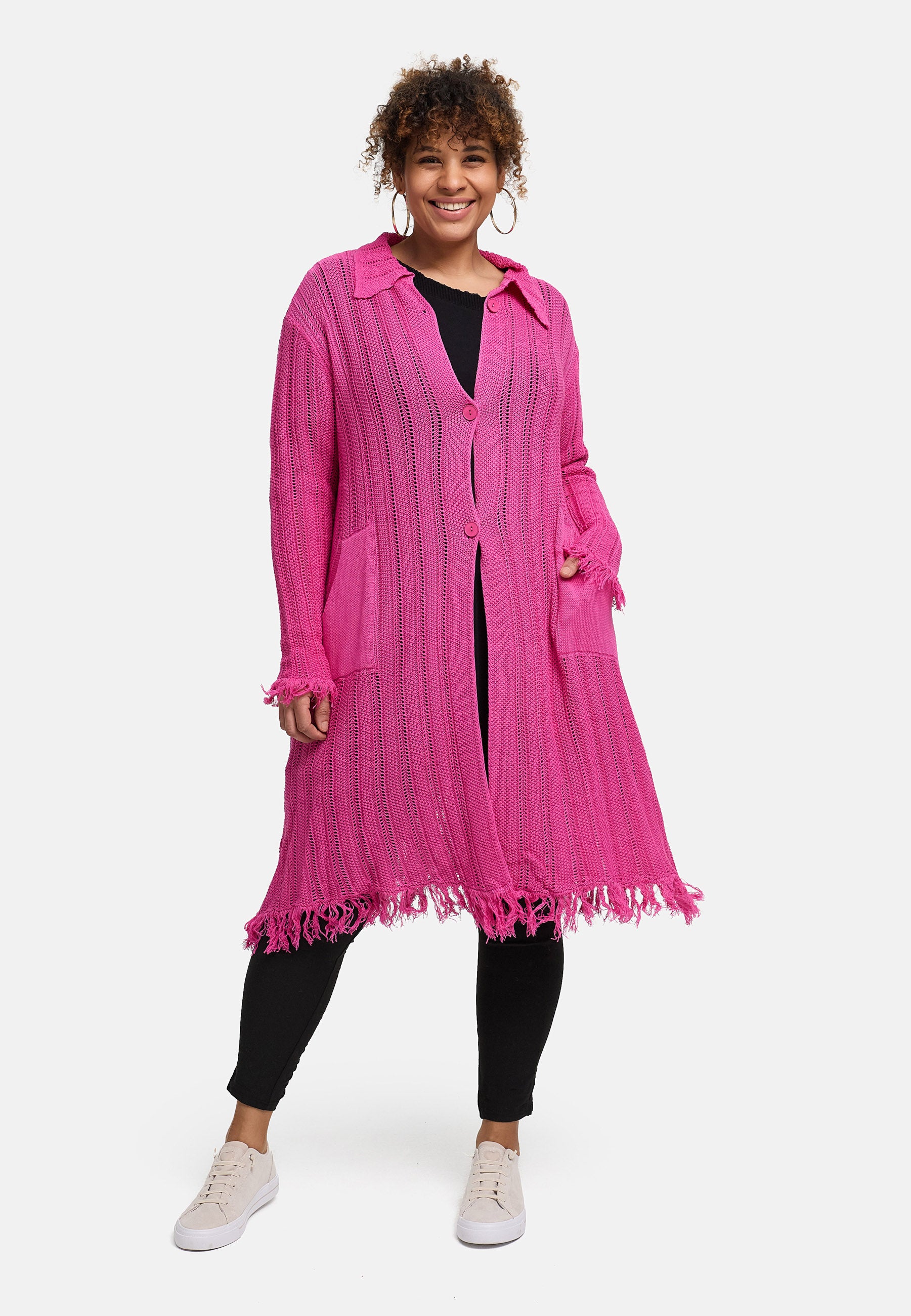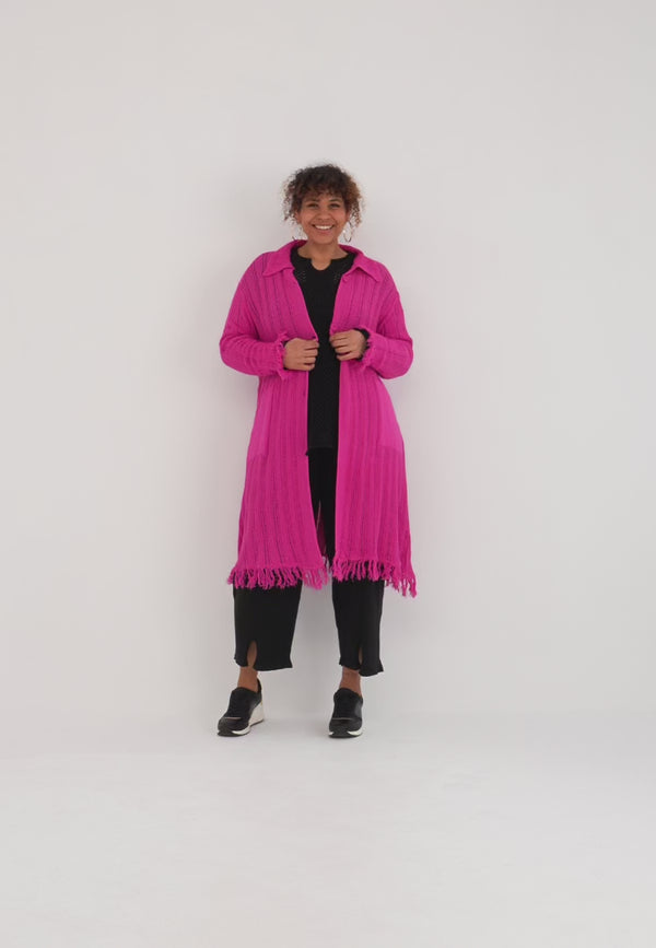 Der offene Baumwollstrick sorgt für Atmungsaktivität und ein unkompliziertes Tragegefühl. Die lange, gerade Form streckt optisch, während der Hemdkragen und die durchgehende Knopfleiste der Jacke eine saubere Linie geben. Aufgesetzte Taschen bieten Platz für Essentials. Fransige Abschlüsse an Saum und Ärmeln setzen einen entspannten Akzent – in Beige wirkt die Jacke natürlich, in Pink zum echten Blickfang.
